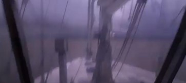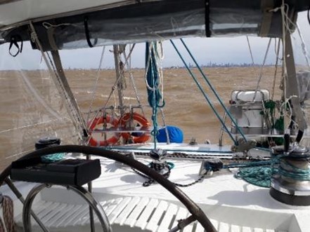 Pero los pronósticos son eso… pronósticos y a media tarde el cielo se fue poniendo cada vez más oscuro y una línea neta de nubes bajas paralelas a la costa argentina avanzando desde el oeste, tan bien conocida para los navegantes del Río de la Plata, nos puso en alerta. Bajamos todas las velas para quedarnos a palo seco y esperar el sifonazo, cosa que no ocurrió, vino en cambio un oeste con vientos de 30 a 35 nudos y algo de lluvia, a continuación y extrañamente el viento rotó al norte y aumentó hasta llegar a unos 50 nudos. A palo seco el Caoba con viento franco la corría a unos 6 nudos de velocidad llevado por su piloto automático, una tranquilidad a bordo sin problemas, la tripulación dentro de la chubasquera o en la dinette.