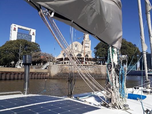 Si bien estaba todo preparado, apuramos los últimos mates para dejar la marina y tomar puntuales el puente de las 7 AM de Dársena Norte, que se abrió sólo para nosotros y las dos embarcaciones que nos acompañaban en la salida, un velero y un gomón que llevaban amigos, tripulantes que se suman en otros tramos, fotógrafos que nos filmaban, dron incluido… Desde tierra también nos registraban amigos con sus cámaras y saludos. En sí, una salida muy emotiva, breve y casi irreal ya que luego de cerca de 8 meses de cuarentena salir en un viaje de ensueño sonaba surrealista, como si estuviéramos viviendo una realidad paralela.