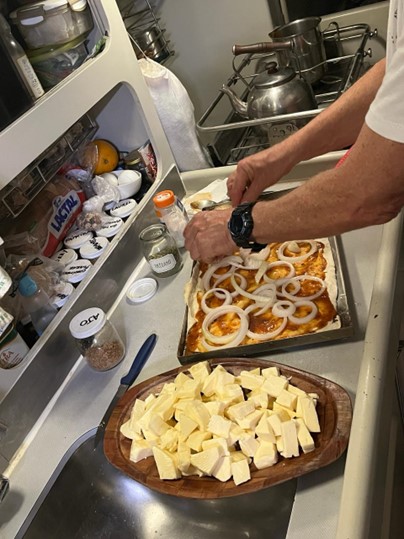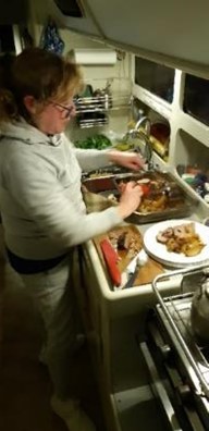 ¿Qué decir de los almuerzos? Gracias a la mano de Claudia, comimos rico, sano y variado, lo recomendable siempre que se navega por varios días. El único exceso fue el queso. Por alguna razón, teníamos queso para sobrevivir a fondue por varios meses. De las bebidas etílicas mejor me reservo. Yo por costumbre, en general no bebo alcohol a bordo, pero una noche claudiqué y no me pude resistir un vinito tinto delicioso par acompañar la pasta que preparó Silvana. En general, como casi no cocino, yo siempre prefiero lavar los platos y la cocina.