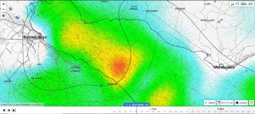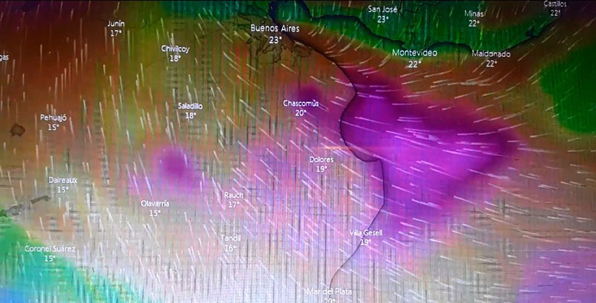 Unas horas después comenzó a cargarse el cielo desde el WNW, para luego entrar un frente de pampero de unos 35 nudos. Los mensajes llegaban a los celulares avisando que en Buenos Aires se llovía todo. Las nubes del frente llegaron a nosotros con poca fuerza y sin lluvia.