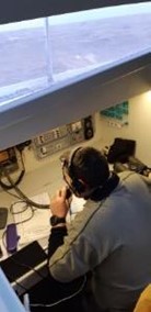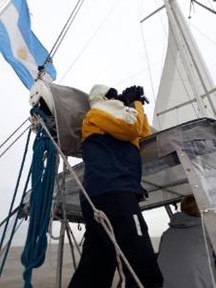 Se avista la costa de Mar del Plata, aproximadamente a 10 millas náuticas. Pronto se realiza la reducción de velocidad y se preparan las velas para la entrada al puerto. Vemos pesqueros de bandera chinca esperando para entrar. La tripulación se coordina para las maniobras de entrada, asegurando que todo esté en orden. El capitán anuncia por radio el arribo a Puerto.