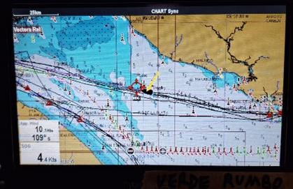En el camino a Camarones distante 550 millas náuticas las hicimos en 4 días y unas 6 horas nos pasó de todo menos calma: vientos francos suaves, fuertes, mar serena y mar arbolada, noches serenas y noches de coctelera como la noche del 10 al 11 de Enero en que el pronóstico daba 26 nudos de racha y tuvimos mas de 40, el Caoba parecía una tabla de surf, no bajaba de 8 nudos con un máximo de mas de 11. El cuarto tripulante (el piloto automático) se portó de maravillas y llevaba el barco mejor que cualquiera de nosotros, gran ayuda.