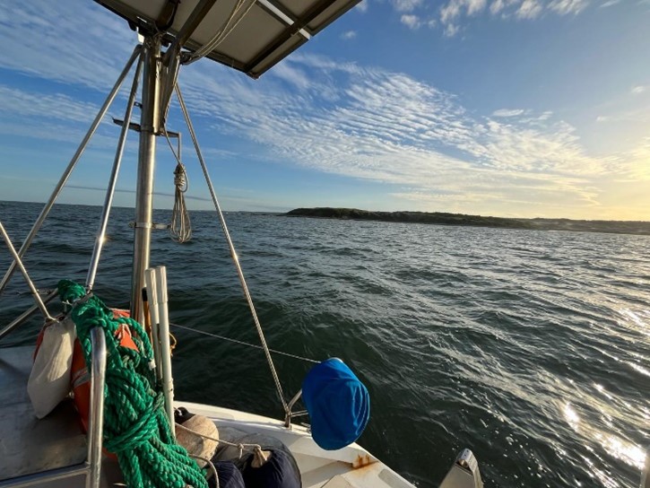 Algunas horas de ese primer día, pese a la inicial resistencia de la tripulación, nos vimos obligados a apoyarnos en el motor, la única opción que nos daría garantía de mantener una velocidad estable y avanzar en rumbo. Hacia el atardecer, el Caoba comienza a adentrarse en el mar abierto, vamos con toda la vela aprovechando un viento moderado del sudeste, lo que nos permite a la tardecita optimizar el curso, aunque seguimos gran parte del día y noche con viento en contra. Entramos a la Bahía de Samborombón con viento de frente. Esperamos la virazón y luego otra vez motor en dirección a Punta Rasa.